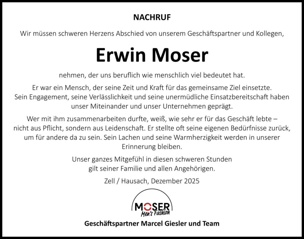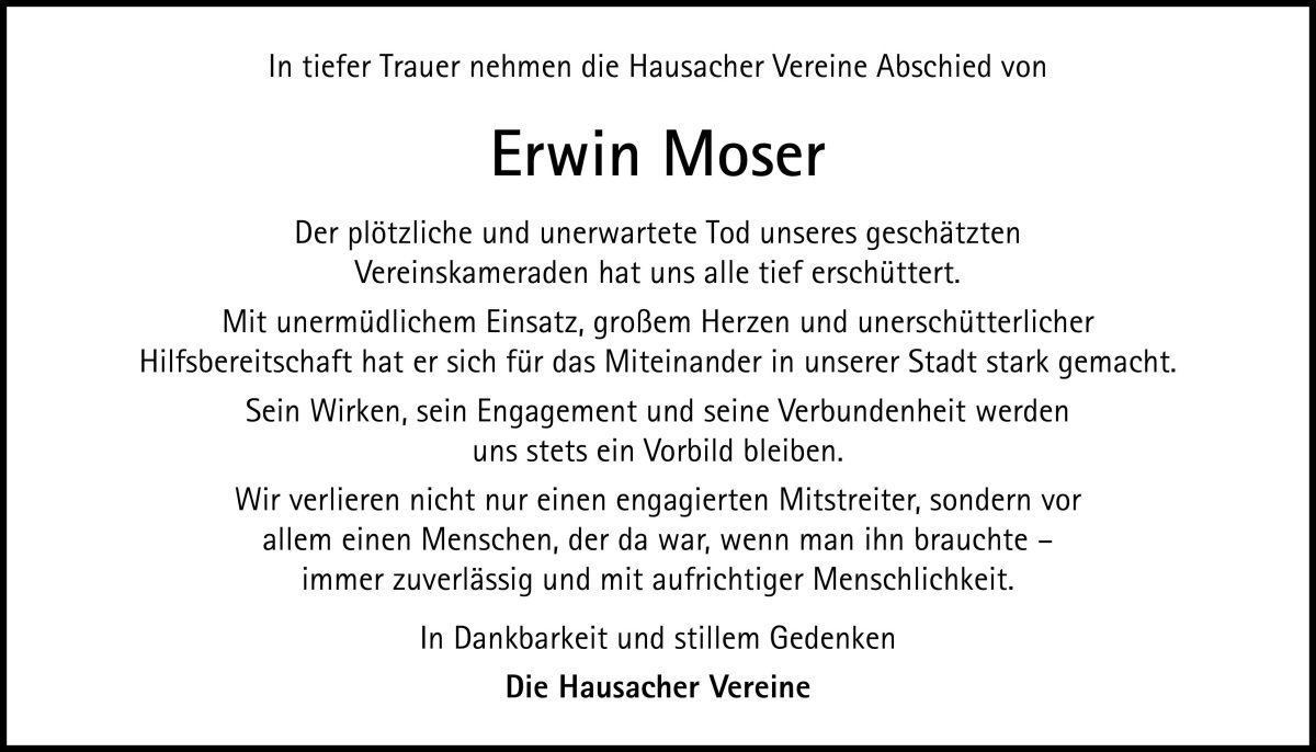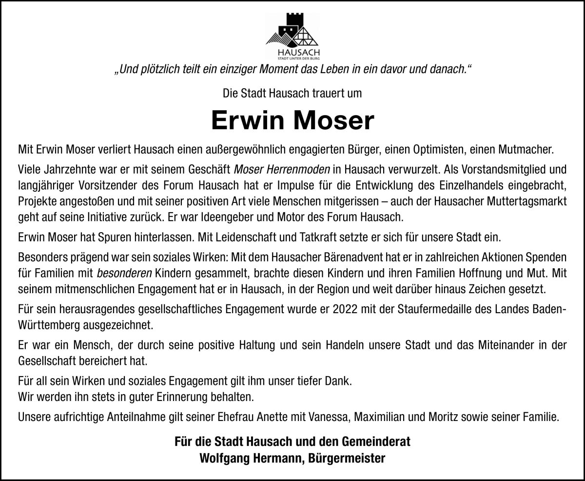 „Mit dem plötzlichen Tod von Erwin Moser verliert Hausach einen außergewöhnlichen Menschen, dessen Engagement und Herzlichkeit unsere Stadt und die Region über Jahrzehnte geprägt haben“, sagt Bürgermeister Wolfgang Hermann.