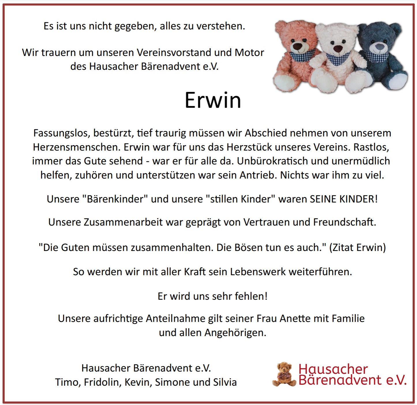 Wenn wir heute an Erwin denken, dann denken wir an sein warmes Lächeln, an seine humorvolle Art, an seine tiefe Menschlichkeit. Er war derjenige, der auch in stressigen Zeiten Ruhe und Zuversicht ausgestrahlt hat. Derjenige, der uns daran erinnert hat, warum wir tun, was wir tun: Weil der Bärenadvent Menschen glücklich macht, und weil Gemeinschaft etwas ist, das gepflegt werden muss – mit Herz und mit Hingabe. Beides hatte Erwin im Überfluss.